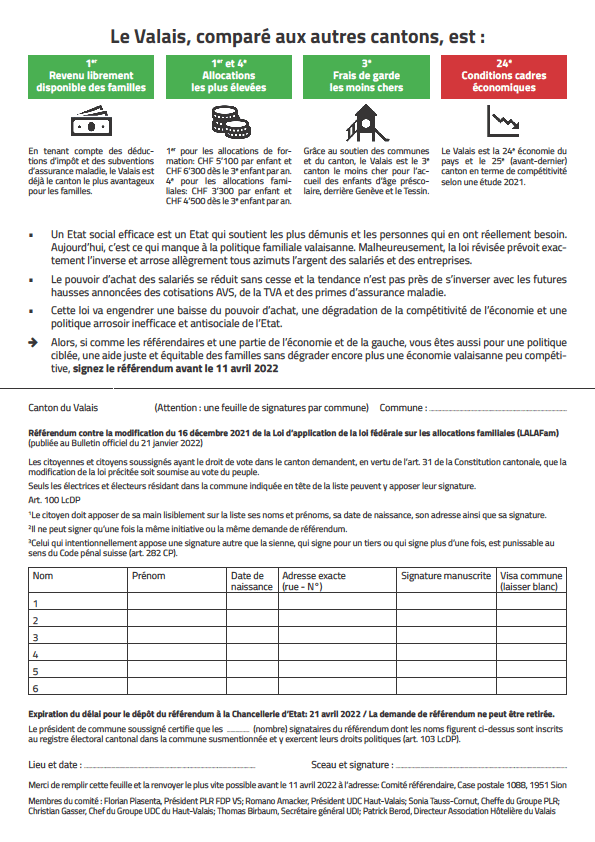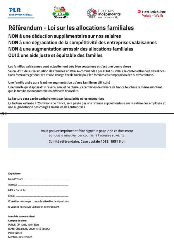 Comme vous l’aurez lu sur la presse ou entendu sur les ondes radiophoniques, le PLR/FDP associés à l’UDC du haut-valais, l’Union des Indépendants et l’association Hôtelière du valais, lançons un référendum sur la révision de la loi sur les allocations familiales. Je compte sur votre soutien en vous investissant dans la récolte de signatures, afin de faire aboutir ce référendum.