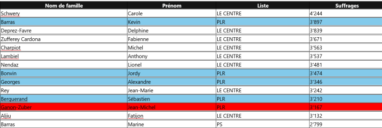 N° 1, Stéphane Ganzer qui sort le meilleur élu non seulement du district, mais de tout le canton. Il sera notre locomotive au Grand conseil, suivi de très prêt par la nouvelle présidente de Chalais, Sylvie Masserey-Anselin, ancienne chef de groupe au district, qui sera aussi une personnalité importante pour notre groupe.